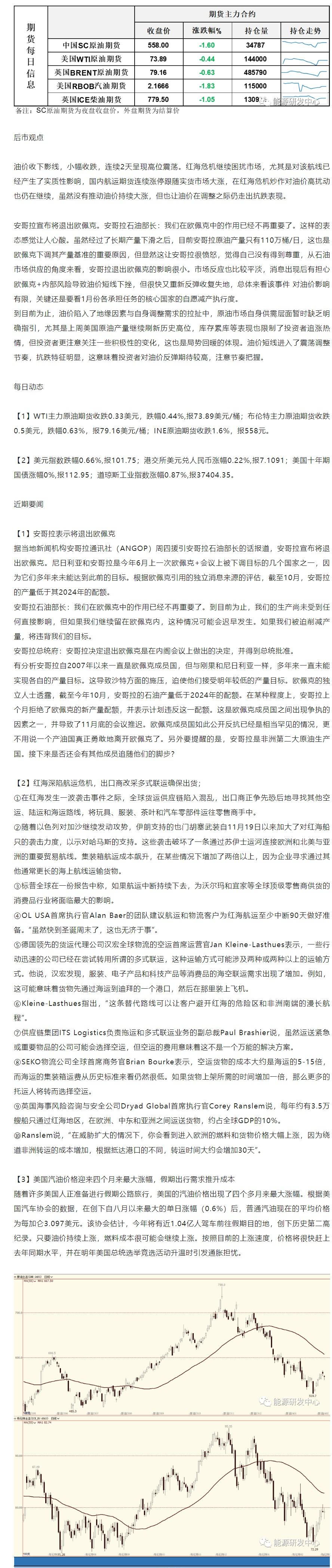油价收下影线,小幅收跌,连续2天呈现高位震荡。红海危机继续困扰市场,尤其是对该航线已经产生了实质性影响,国内航运期货连续涨停跟随实货市场大涨,在红海危机炒作对油价高扰动也仍在继续,虽然没有推动油价持续大涨,但也让油价在调整之际仍走出抗跌表现。