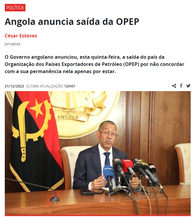据官方媒体《安哥拉日报》(Jornal de Angola)周四(12月21日)报道,安哥拉矿产资源、石油和天然气部部长迪亚曼蒂诺·阿泽维多(Diamantino Pedro Azevedo)宣布,该国于当天退出石油输出国组织(欧佩克)。