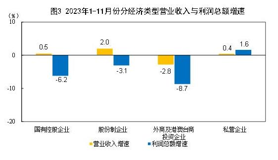 1—11月份,规模以上工业企业中,国有控股企业实现利润总额22411.4亿元,同比下降6.2%;股份制企业实现利润总额51593.7亿元,下降3.1%;外商及港澳台商投资企业实现利润总额16217.8亿元,下降8.7%;私营企业实现利润总额20023.1亿元,增长1.6%。