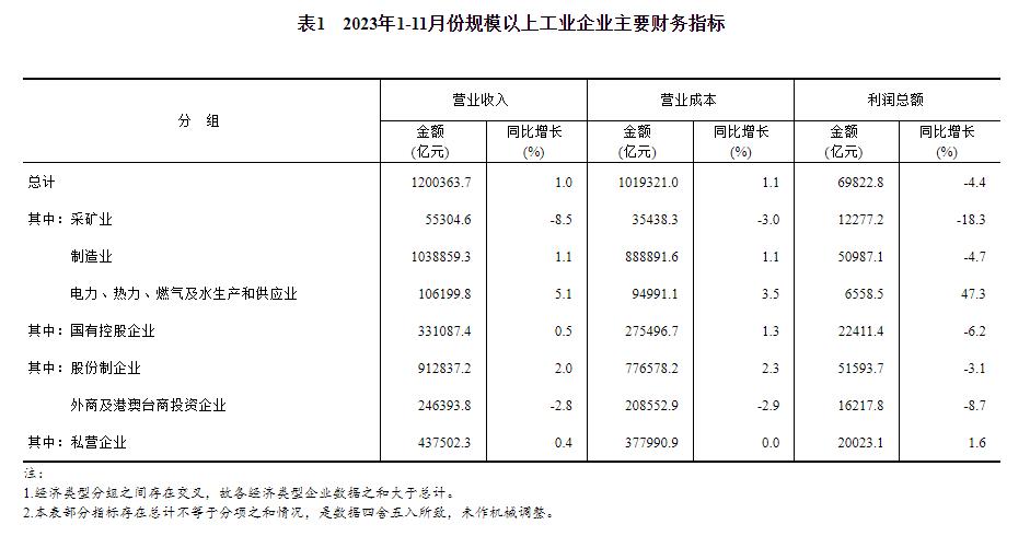 1—11月份,规模以上工业企业实现营业收入120.04万亿元,同比增长1.0%;发生营业成本101.93万亿元,增长1.1%;营业收入利润率为5.82%,同比下降0.32个百分点。