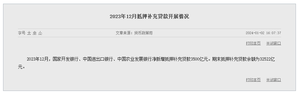 1月2日,央行货币政策司抵押补充贷款工作信息发布最新数据,2023年12月,国家开发银行、中国进出口银行、中国农业发展银行净新增抵押补充贷款(PSL)3500亿元,期末抵押补充贷款余额为32522亿元。