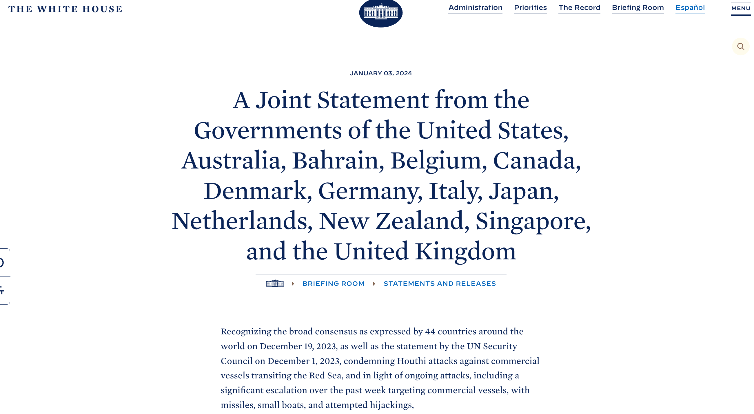 “如果胡塞武装继续威胁到生命、威胁到全球经济和地区关键水道的商业自由流动,他们将承担后果,” 包括美国、英国、澳大利亚、巴林、比利时、加拿大、丹麦、德国、意大利、日本、荷兰、新西兰和新加坡在内的各国政府在一份联合声明中表示。
