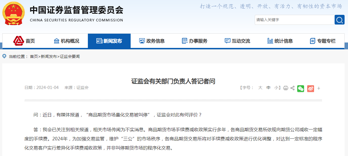 问:近日,有媒体报道,“商品期货市场量化交易被叫停”,证监会对此有何评价?