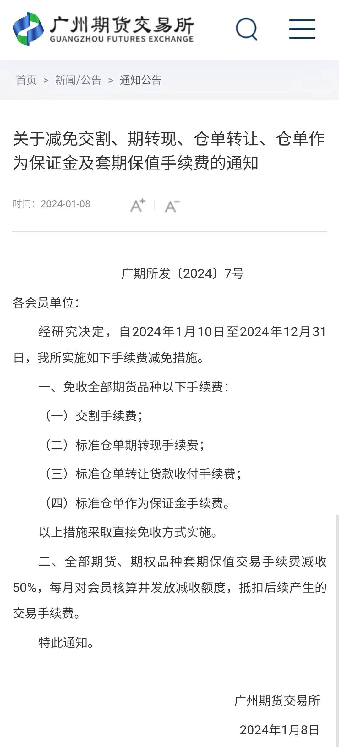 1月8日,广州期货交易所发布公告称:自2024年1月10日至2024年12月31日,将对全部期货品种的交割手续费、标准仓单期转现手续费、标准仓单转让货款收付手续费,以及标准仓单作为保证金手续费,采取直接免收方式实施。