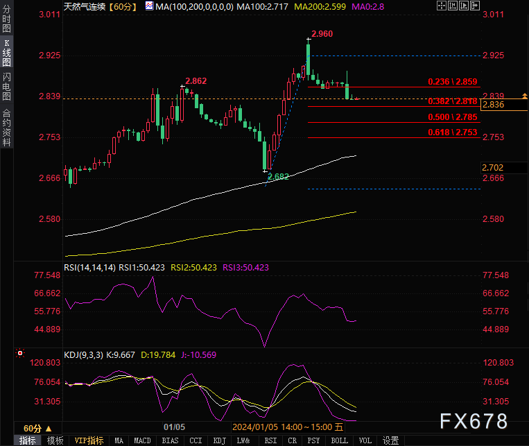 周二(1月8日),欧洲时段,天然气连续高开低走,大幅下跌,现报2.837美元,跌幅1.93%。