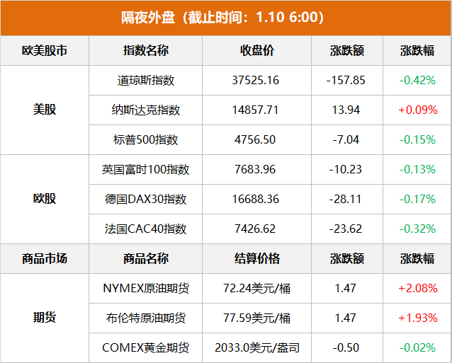 国际原油:国际油价9日上涨,截至当天收盘,纽约商品交易所2月交货的轻质原油期货价格上涨1.47美元,收于每桶72.24美元,涨幅为2.08%;3月交货的伦敦布伦特原油期货价格上涨1.47美元,收于每桶77.59美元,涨幅为1.93%。