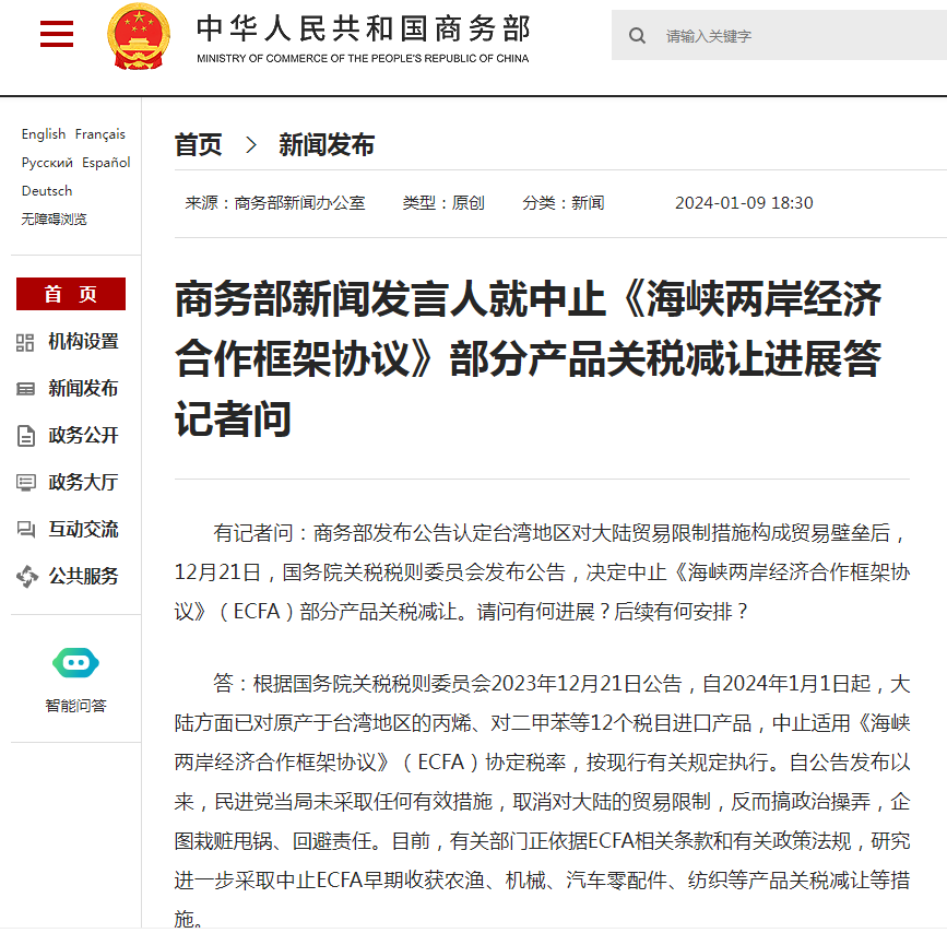 答:根据国务院关税税则委员会2023年12月21日公告,自2024年1月1日起,大陆方面已对原产于台湾地区的丙烯、对二甲苯等12个税目进口产品,中止适用《海峡两岸经济合作框架协议》(ECFA)协定税率,按现行有关规定执行。自公告发布以来,民进党当局未采取任何有效措施,取消对大陆的贸易限制,反而搞政治操弄,企图栽赃甩锅、回避责任。目前,有关部门正依据ECFA相关条款和有关政策法规,研究进一步采取中止ECFA早期收获农渔、机械、汽车零配件、纺织等产品关税减让等措施。