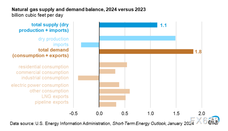EIA预测,到2024年,包括生产和进口在内的天然气供应将增加超过1 Bcf/d(10亿立方英尺/天),美国天然气需求将增加近2 Bcf/d,需求增长主要是出口增长的结果。