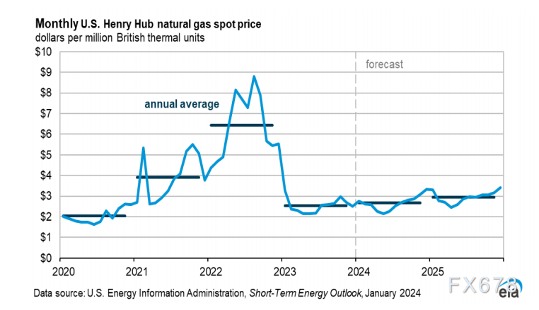 EIA预测,Henry Hub现货天然气在2024年平均价格为2.60美元/MMBtu至2.70美元/MMBtu,比2023年上涨约10美分/MMBtu。2025年,随着液化天然气(LNG)出口的增加,Henry Hub天然气现货价格将再次上涨,平均超过2.90美元/MMBtu。