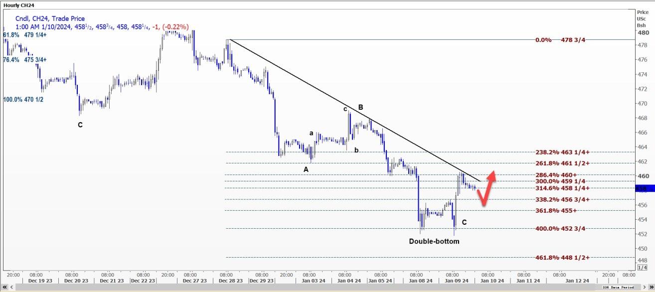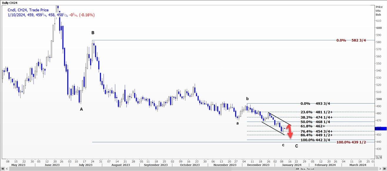 CBOT 3月玉米CH24未能突破4.60美元阻力位且趋势线下降,可能回撤至每蒲式耳4.55美元至4.5675美元的区间。