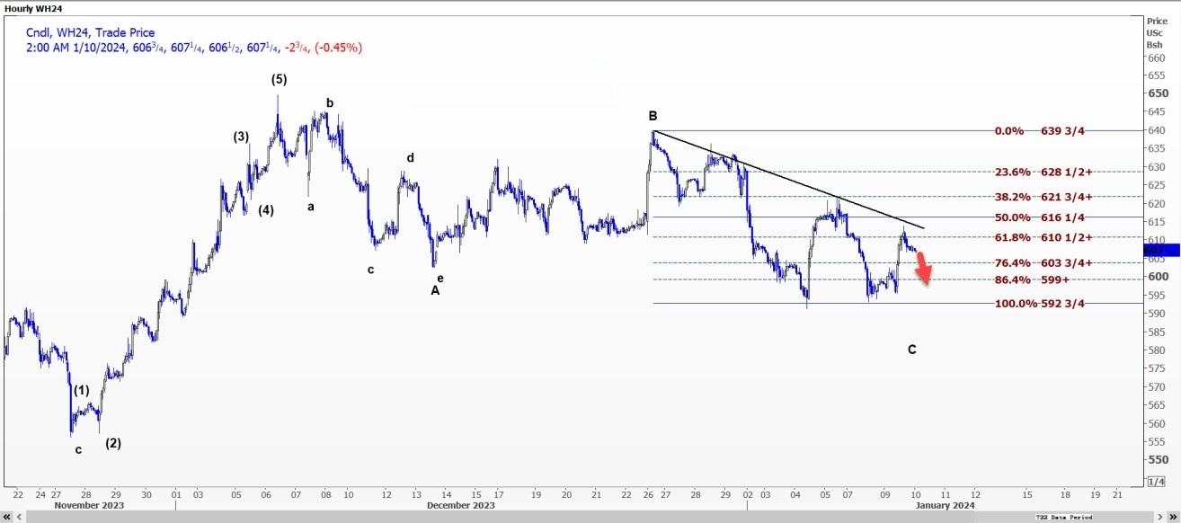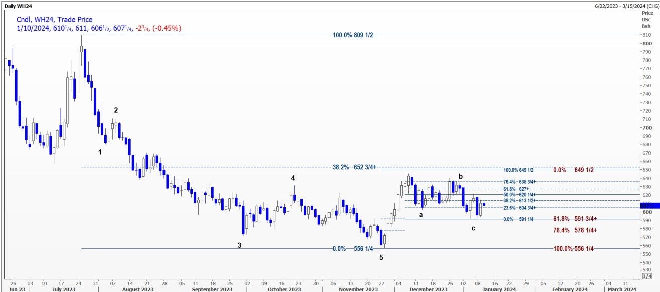 CBOT 3月小麦WH24可能会测试每蒲式耳6.0375美元的支撑位,跌破该支撑位可能会打开通往5.9275美元至5.99美元区间的道路。
