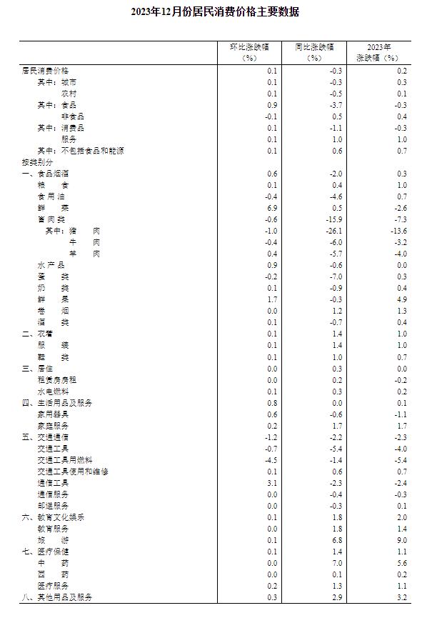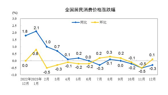 2023年12月份居民消费价格同比下降0.3% 环比上涨0.1%