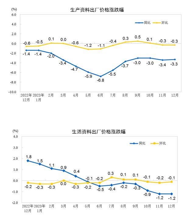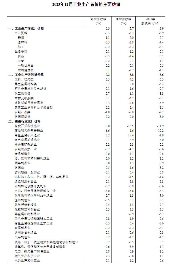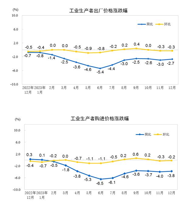 2023年12月份,全国工业生产者出厂价格同比下降2.7%,环比下降0.3%;工业生产者购进价格同比下降3.8%,环比下降0.2%。2023年全年,工业生产者出厂价格比上年下降3.0%,工业生产者购进价格下降3.6%。