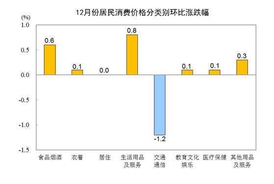12月份,食品烟酒类价格环比上涨0.6%,影响CPI上涨约0.18个百分点。食品中,鲜菜价格上涨6.9%,影响CPI上涨约0.14个百分点;鲜果价格上涨1.7%,影响CPI上涨约0.03个百分点;水产品价格上涨0.9%,影响CPI上涨约0.02个百分点;畜肉类价格下降0.6%,影响CPI下降约0.02个百分点,其中猪肉价格下降1.0%,影响CPI下降约0.01个百分点。