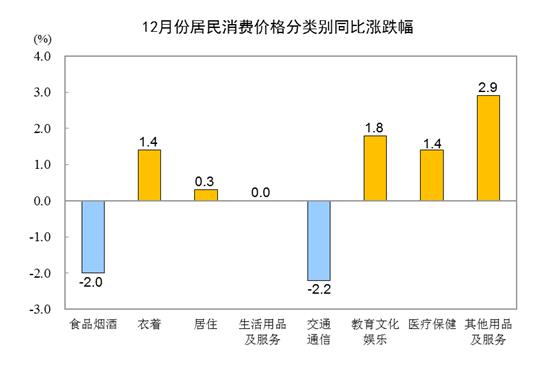 12月份,食品烟酒类价格同比下降2.0%,影响CPI(居民消费价格指数)下降约0.57个百分点。食品中,畜肉类价格下降15.9%,影响CPI下降约0.56个百分点,其中猪肉价格下降26.1%,影响CPI下降约0.43个百分点;蛋类价格下降7.0%,影响CPI下降约0.05个百分点;水产品价格下降0.6%,影响CPI下降约0.01个百分点;鲜果价格下降0.3%,影响CPI下降约0.01个百分点;鲜菜价格上涨0.5%,影响CPI上涨约0.01个百分点;粮食价格上涨0.4%,影响CPI上涨约0.01个百分点。