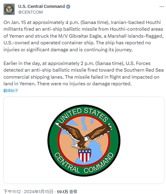 虽然胡塞武装还没有明确表态,但美国中央司令部已经在社交媒体发文确认了这一事实,并强调Gibraltar Eagle号没有报告人员伤亡或船只严重受损。美军同时透露,胡塞武装在周一早些时候还曾经发射过一枚反舰导弹,但导弹没能打到海上,直接在陆地上就炸了。
