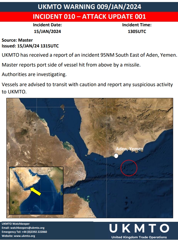 根据英国海事贸易行动办公室(UKMTO)的报道,世界标准时间周一13点05分(北京时间21点05分),在距离也门亚丁东南方向95海里处(下图红圈处)发生一起“导弹击中船只”的事件。
