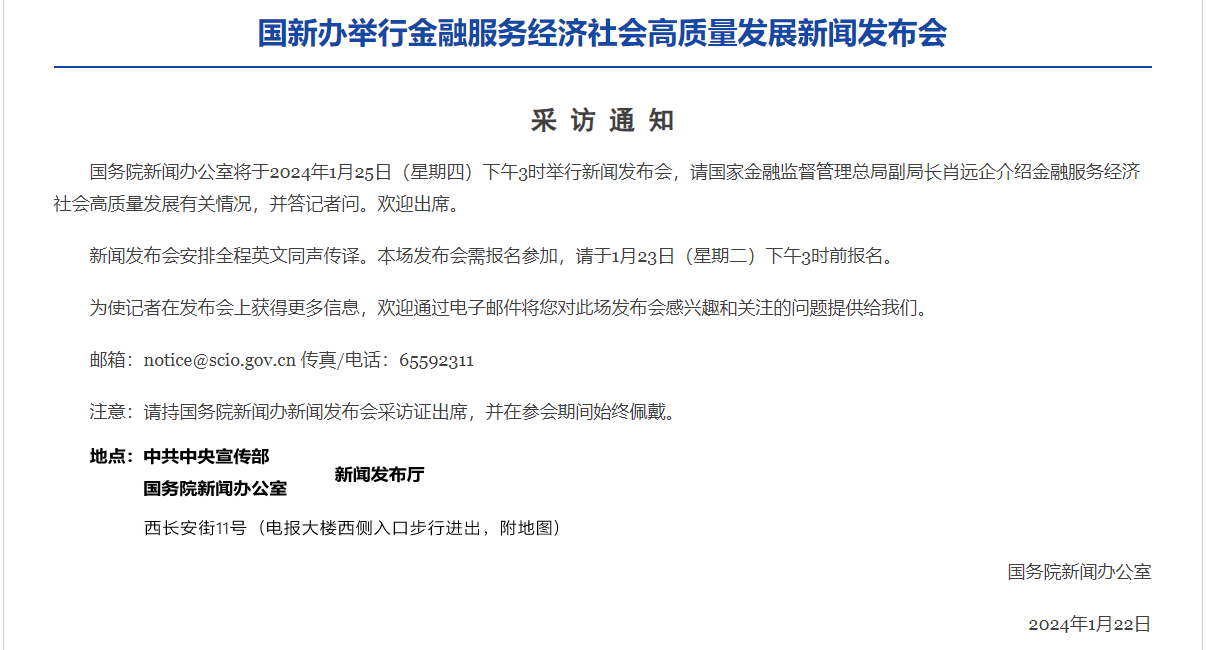 1月25日(星期四)下午3时,国新办将举行新闻发布会,请国家金融监督管理总局副局长肖远企介绍金融服务经济社会高质量发展有关情况,并答记者问。