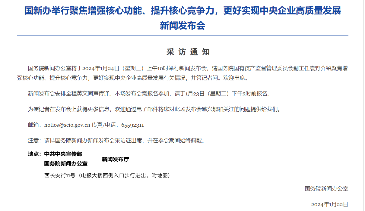 1月24日(星期三)上午10时,国新办将举行新闻发布会,请国务院国有资产监督管理委员会副主任袁野介绍聚焦增强核心功能、提升核心竞争力,更好实现中央企业高质量发展有关情况,并答记者问。