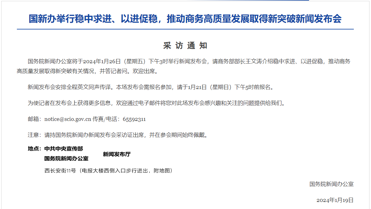 1月26日(星期五)下午3时,国新办将举行新闻发布会,请商务部部长王文涛介绍稳中求进、以进促稳,推动商务高质量发展取得新突破有关情况,并答记者问。