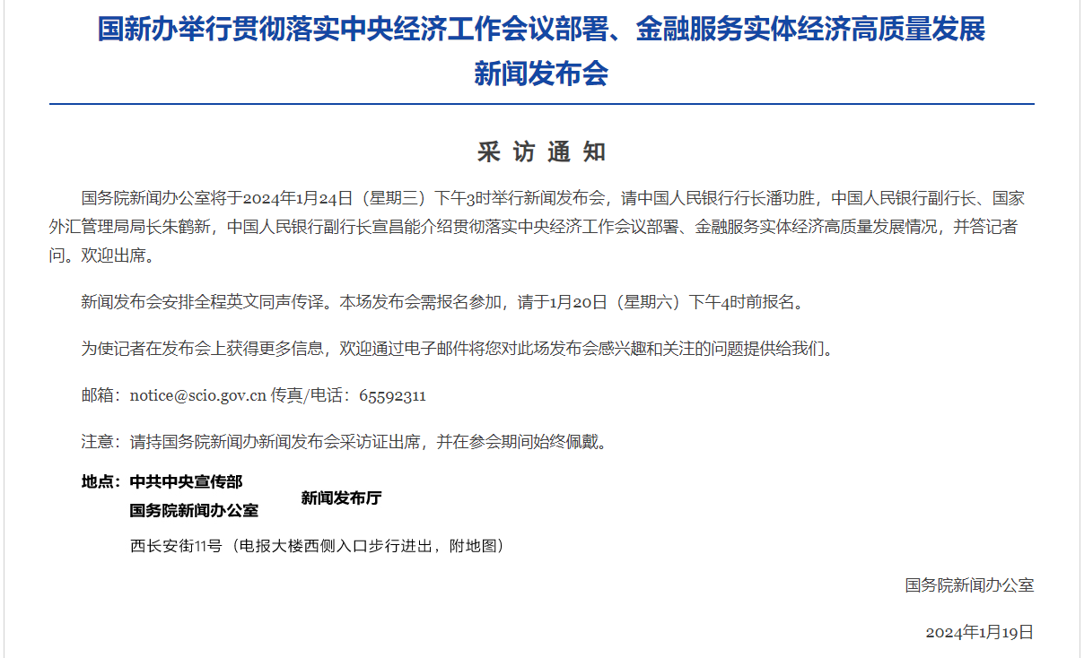 1月24日(星期三)下午3时,国新办将举行新闻发布会,请中国人民银行行长潘功胜,中国人民银行副行长、国家外汇管理局局长朱鹤新,中国人民银行副行长宣昌能介绍贯彻落实中央经济工作会议部署、金融服务实体经济高质量发展情况,并答记者问。