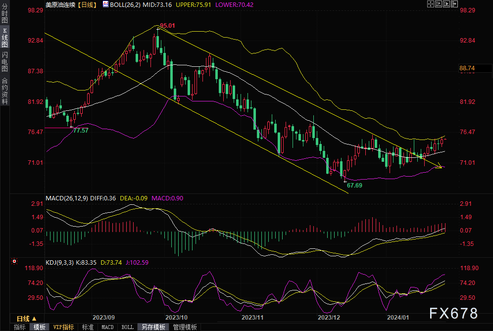 周三(1月24日)尽管早些时候油价小幅上涨,随后再次面临压力,这证明OPEC+目前的石油减产措施根本不够。尤其是当俄罗斯本应承担减产的最大份额时,却没有尊重这些减产,并继续增加原油产量。与此同时,市场正在为2024年进行重新调整,经济增长乏力,而且各国央行并不急于很快放松加息制度,未来还会出现更多问题。同时,美国原油库存大幅下降,以及重点原油使用国经济变化,导致原油价格小幅攀升至逾一个月高位。 WTI 3月原油期货收涨0.72美元,涨幅0.97%,报75.09美元/桶。截至发稿,现报75.32美元/桶,涨幅1.27%。