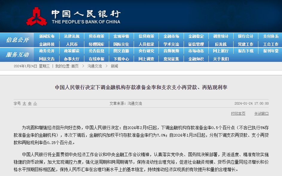 为巩固和增强经济回升向好态势,中国人民银行决定:自2024年2月5日起,下调金融机构存款准备金率0.5个百分点(不含已执行5%存款准备金率的金融机构),本次下调后,金融机构加权平均存款准备金率约为7.0%;自2024年1月25日起,分别下调支农再贷款、支小再贷款和再贴现利率各0.25个百分点。