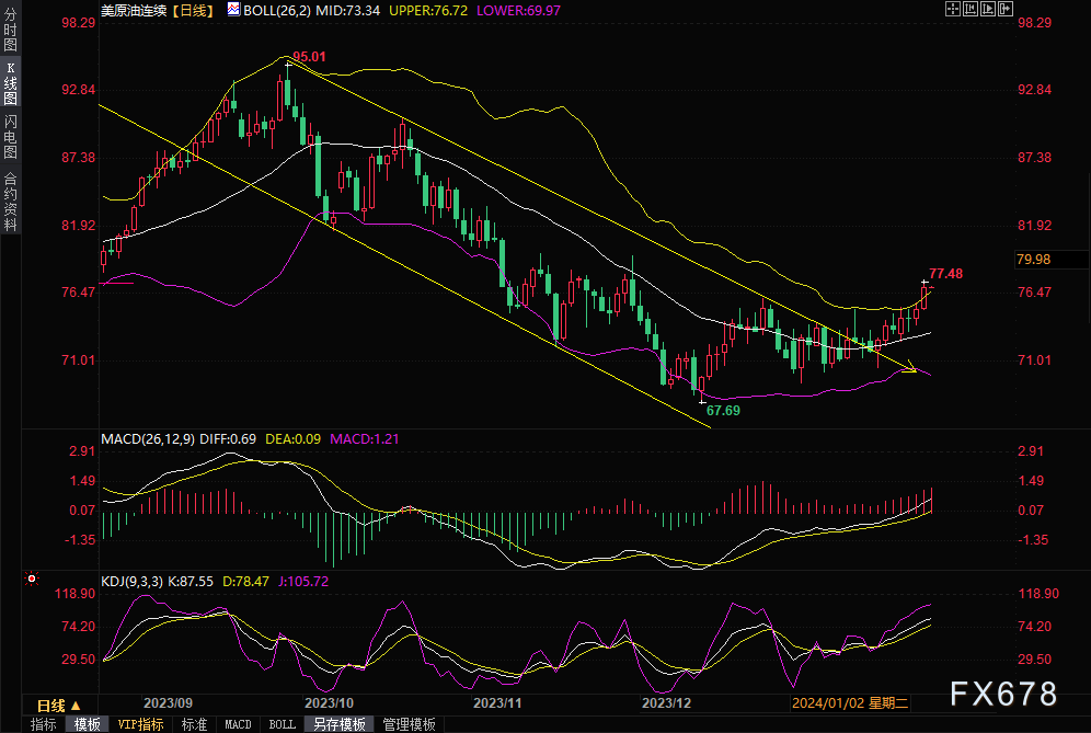 周四(1月25日)由于美国经济数据显示2023年第四季度增长快于预期导致市场乐观情绪,并降低了美联储降息预期,同时,红海紧张局势持续扰乱全球贸易,油价周四上涨约3%,收于去年12月以来的最高水平。 WTI原油期货2024年3月合约结算价收报77.36美元/桶,收涨3.02%或2.27美元/桶。