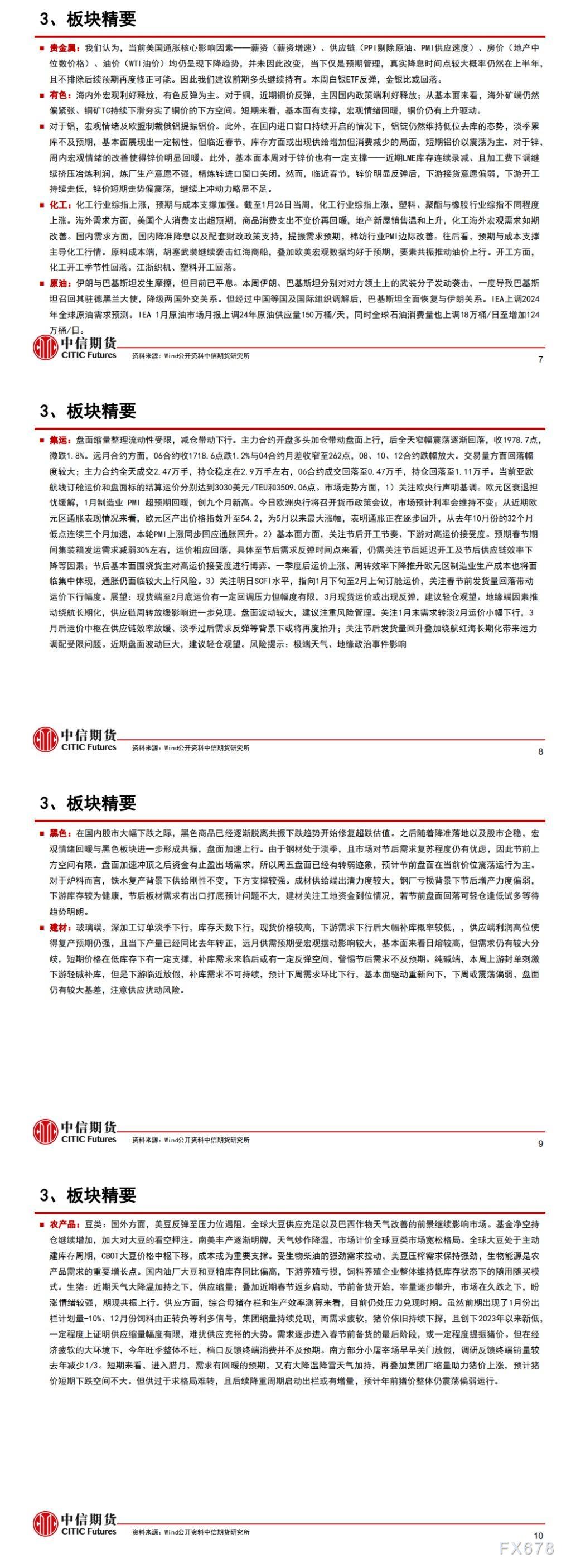 贵金属:我们认为,当前美国通胀核心影响因素一一薪资(薪资增速〕、供应链(PPI剔除原油、PMI供应速度)、房价(地产中位数价格)、油价(WTI油价)均仍呈现下降趋势,并未因此改变,当下仅是预期管理,真实降息时间点较大概率仍然在上半年,且不排除后续预期再度修正可能。因此我们建议前期多头继续持有。本周白银ETF反弹,金银比或回落。 有色:海内外宏观利好释放,有色反弹为主。对于铜,近期铜价反弹,主因国内政策端利好释放;从基本面来看,海外矿端仍然偏紧张、铜矿TC持续下滑夯实了铜价的下方空间。短期来看,基本面有支撑,宏观情绪回曝,铜价仍有上升驱动。 化工:化工行业综指上涨,预期与成本支撑加强。截至1月26日当周,化工行业综指上涨,塑料、聚酯与橡胶行业综指不同程度上涨。海外需求方面,美国个人消费支出超预期,商品消费支出不变价再回媛,地产新屋销售温和上升,化工海外宏观需求如期改善。国内需求方面,国内降准降息以及配套财政政策支持,提振需求预期,棉纺行业叫PMI边际改善。往后看,预期与成本支撑主导化工行情。原料成本端,胡塞武装继续袭击红海商船,叠加欧美宏观数据均好于预期,要素共振推动油价上行。开工方面,化工开工季节性回落·江浙织机、塑料开工回落。 原油:伊朗与巴基斯坦发生摩擦,但目前已平息。本周律朗、巴基斯坦分别对对方领土上的武裝分子发动袭击,一度导致巴基斯坦召回其驻德黑兰大使,降级两国外交关系。但经过中国等国及国际组织调解后,巴基斯坦全面恢复与伊朗关系。IEA上调2024年全球原油需求预测。IEA1月原油市场月报上调24年原油供应量1万桶/天,同时全球石油消费量也上调18万桶/日至增加124力桶/日。