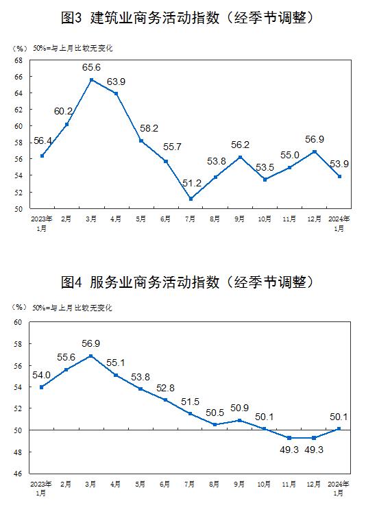 (二)建筑业商务活动指数有所回落。受冬季低温天气及春节假日临近等因素影响,建筑业进入施工淡季,商务活动指数为53.9%,比上月下降3.0个百分点。从市场预期看,业务活动预期指数为61.9%,持续位于高位景气区间,表明建筑业企业对市场发展信心较强。