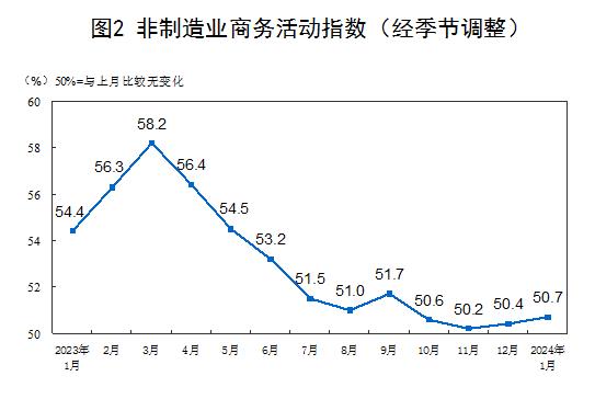 1月份,非制造业商务活动指数为50.7%,比上月上升0.3个百分点,非制造业延续平稳扩张走势。