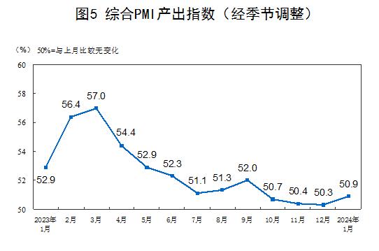 1月份,综合PMI产出指数为50.9%,比上月上升0.6个百分点,表明我国企业生产经营活动继续保持扩张。构成综合PMI产出指数的制造业生产指数和非制造业商务活动指数分别为51.3%和50.7%。