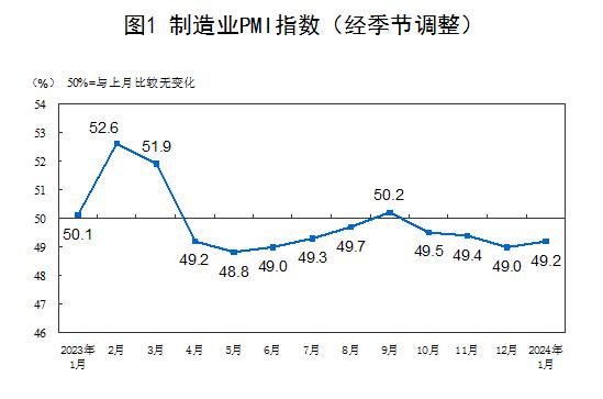 1月份,制造业采购经理指数(PMI)为49.2%,比上月上升0.2个百分点,制造业景气水平有所回升。