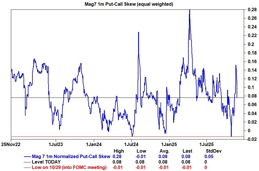 大型科技股仓位回归中性: 此前,市场对七大科技巨头(Mag 7)的看涨情绪极度拥挤,其期权市场的看涨/看跌期权偏度(put-call skew)甚至出现倒挂(看涨期权价格高于看跌期权)。这种极端看涨的仓位在上周被迅速扭转,目前已回归中性水平。