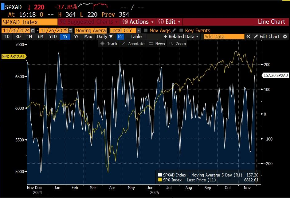 市场广度显著改善: 市场上涨的参与度正在扩大。衡量市场广度的标普500上涨/下跌股票数量5日移动平均线,已从11月早些时候的-150(代表盘面下存在严重损伤)强劲反弹至+150区域。这表明上涨不再局限于少数股票,而是更广泛的参与。