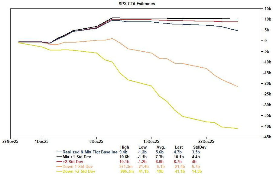 首先,系统性资金的去风险过程已基本完成。高盛估计,在过去一个月中,系统性策略基金在标普500指数上进行了约160亿美元的卖出。展望未来,下一个月的基准情景已转变为温和买入(约47亿美元),这使得由系统性资金引发的强制性抛售尾部风险已“显著下降”。