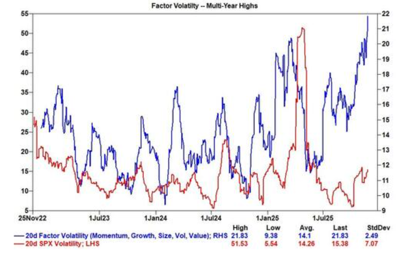 数据显示,20天因子波动率已升至20以上,而标普500指数的波动率仅温和上行。这意味着,那些在特定投资风格上押下重注的投资组合(如成长股 vs 价值股,或AI赢家 vs 其他股票),其波动远大于市场整体表现。