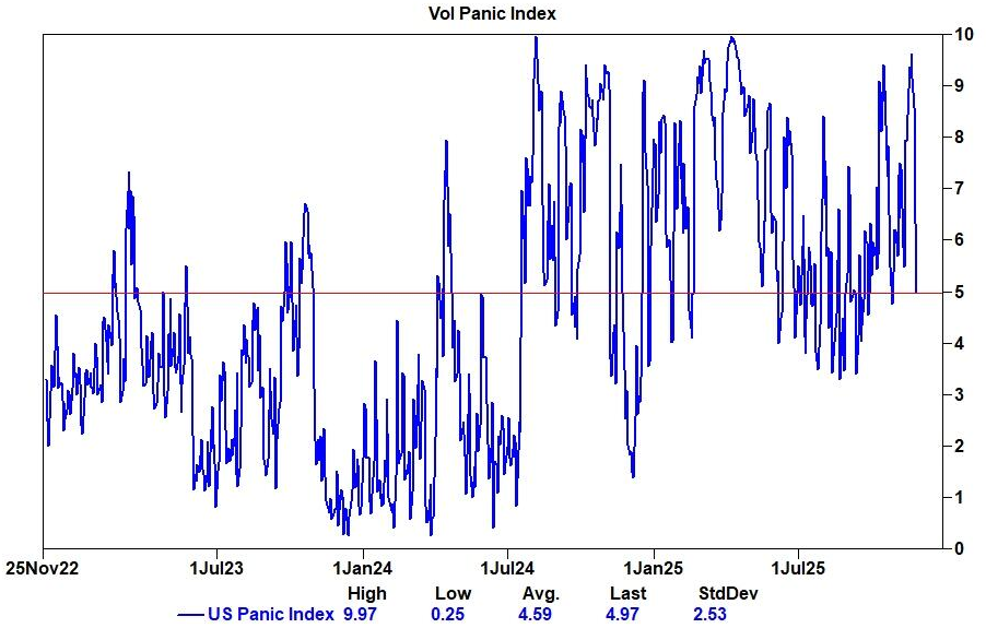 波动率恐慌情绪冷却: 高盛的“波动率恐慌指数”(Vol Panic Index)已从本月高点回落至5,略高于其3年期平均值4.6。构成该指数的引申波幅、波动率的波动率(vol-of-vol)和期权偏度等多个分项指标均已同步降温。
