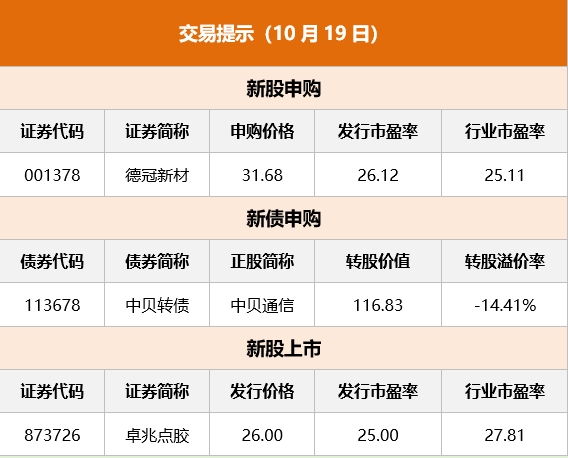 龙虎榜:10月18日,日内上榜龙虎榜个股中,资金净流入最高的是大北农,为1.58亿元。机构参与龙虎榜中个券共涉及28只(1只可转债),其中12只个券(1只可转债)被机构净买入,致远新能被买入最多,为4529.82万元。另外16股被机构净卖出,浪潮信息被卖出最多,为4.91亿元。