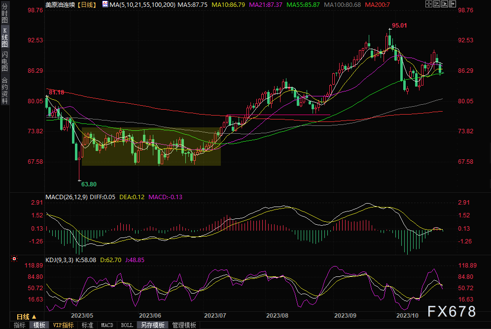 随着外交努力缓解中东紧张局势,原油价格下滑,巴以冲突造成的潜在供应限制正在缓解,周一投资者出现乐观情绪,原油价格跌幅近3%。 纽约交易的12月交割的西德克萨斯中质原油(WTI)结算价为85.49美元/桶,下跌2.59美元/桶,跌幅2.94%,盘中最低触及85.35美元/桶,为近一周新低。WTI上周上涨2%,前一周涨幅约为6%。