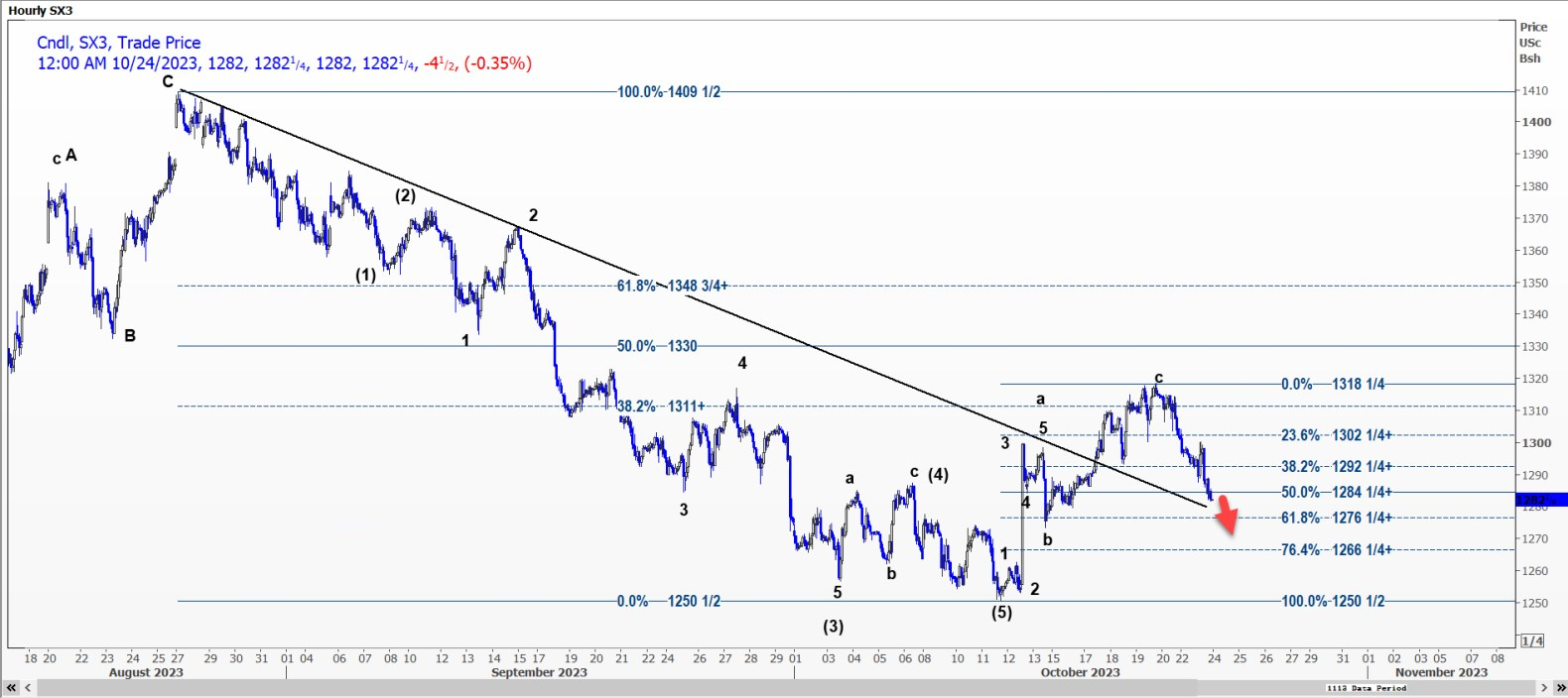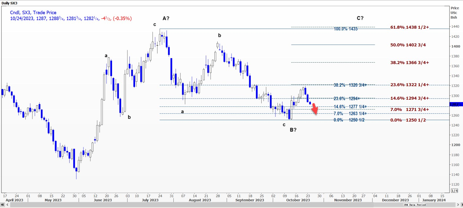 从1250.50美分/蒲式耳的上涨采取了修正浪模式。第二浪b浪结束于1276美分/蒲式耳附近,作为目标位。
