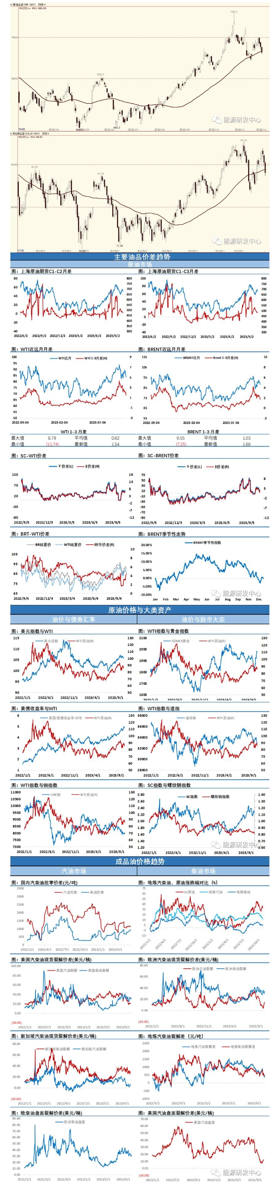 后市观点 油价连续大跌,凌晨API数据显示美国原油成品油均有超预期去库表现,但利多数据只是给油价带来了较为微弱的反弹,显示市场看涨热情迅速消退,油价连续三天快速回调回吐了巴以冲突之后的大半涨幅。 随着时间推移,没有进一步激化的巴以冲突带来的地缘溢价正在回撤。对于原油来讲除了地缘因素之外,原油市场低库存格局也会限制油价回调空间,但供需层面已经很难继续给油价提供上行驱动。这一点从8月之后全球裂解差走弱以及近期原油月间差持续回落体现的非常明显。油价正在回到10月初投资者预期趋于谨慎的局面。