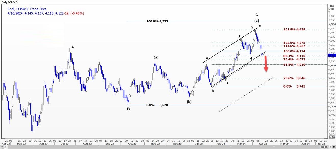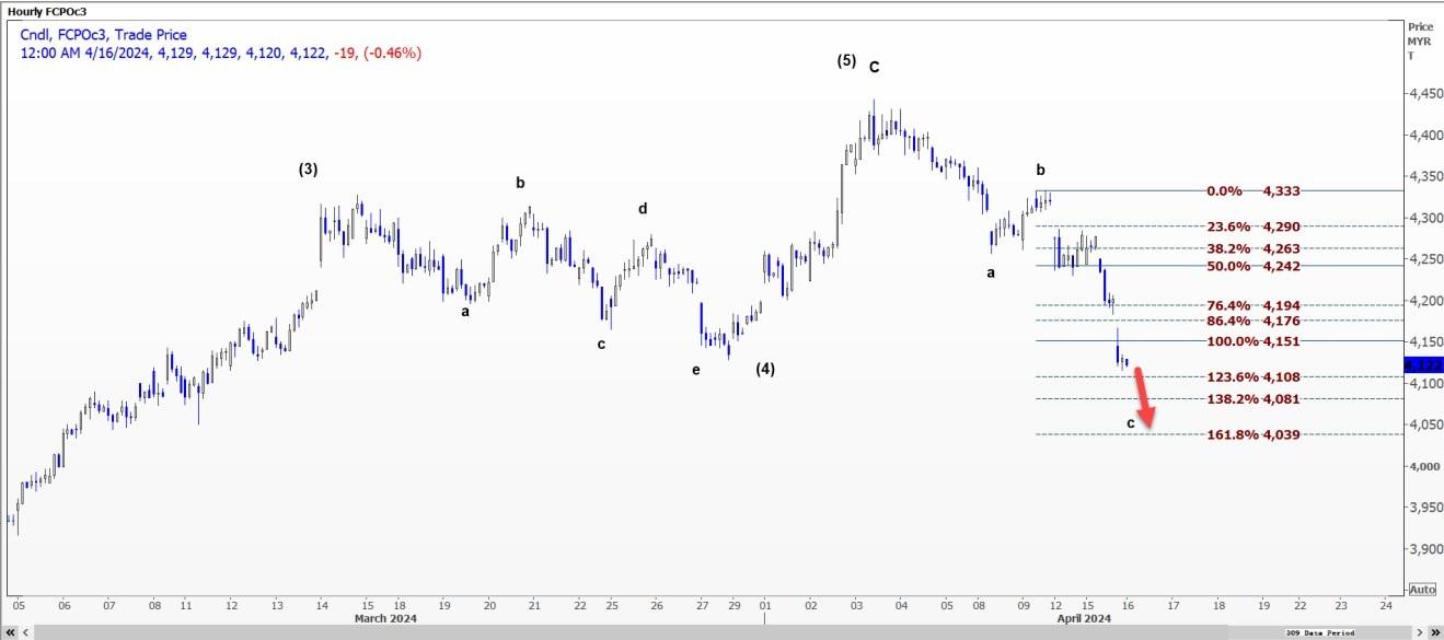 受c浪推动,棕榈油FCPOc3可能扩大跌幅至每公吨4039-4081林吉特的区间。