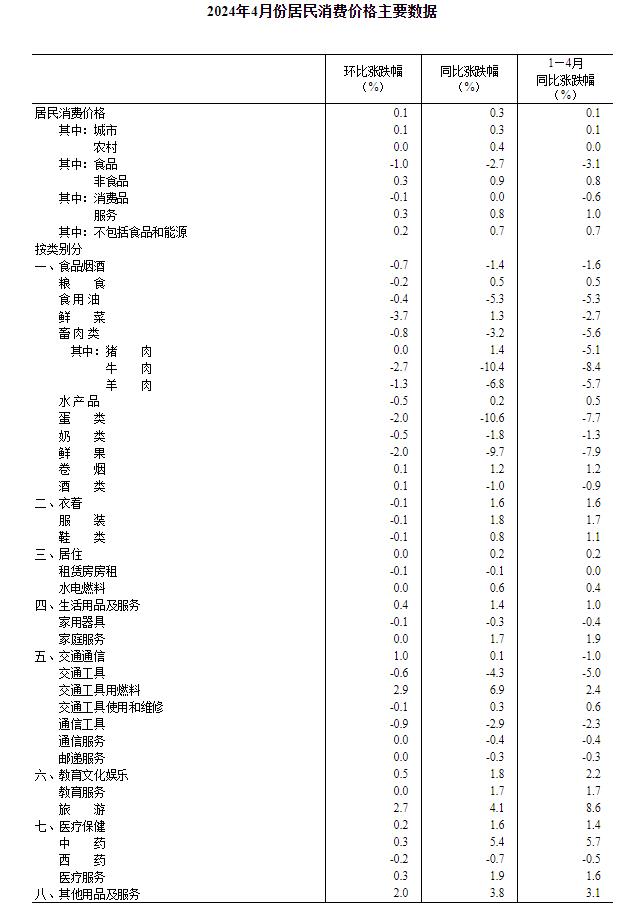 2024年4月份,全国居民消费价格同比上涨0.3%。其中,城市上涨0.3%,农村上涨0.4%;食品价格下降2.7%,非食品价格上涨0.9%;消费品价格持平,服务价格上涨0.8%。1--—4月平均,全国居民消费价格比上年同期上涨0.1%。