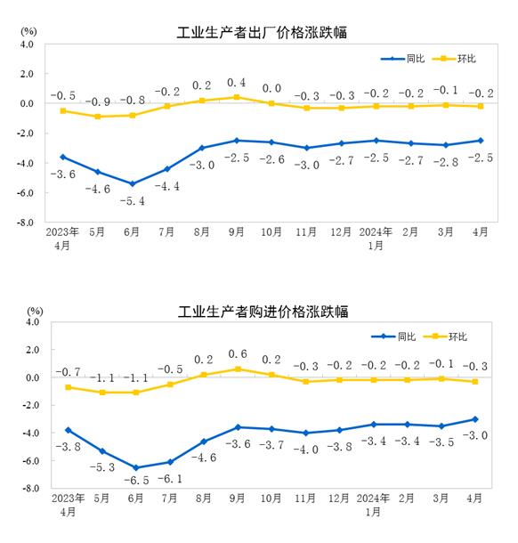 2024年4月份,全国工业生产者出厂价格同比下降2.5%,工业生产者购进价格同比下降3.0%,降幅比上月分别收窄0.3、0.5个百分点;工业生产者出厂价格和购进价格环比分别下降0.2%、0.3%。1—4月平均,工业生产者出厂价格比上年同期下降2.7%,工业生产者购进价格下降3.3%。