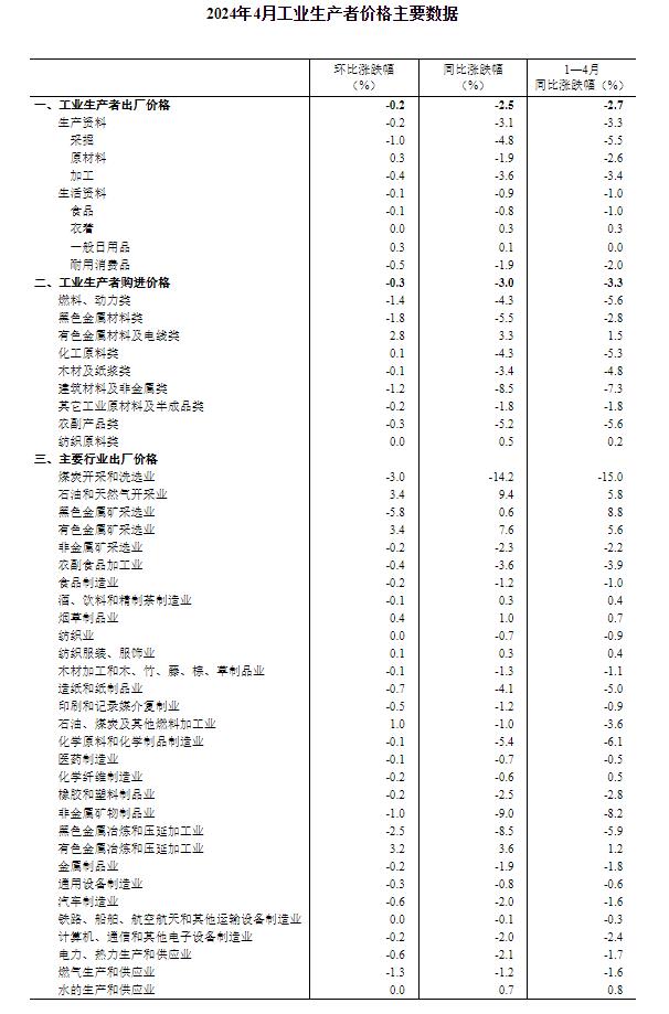 2024年4月份工业生产者出厂价格同比降幅收窄