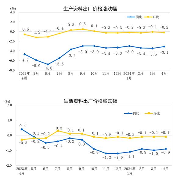 从环比看,PPI下降0.2%,降幅比上月扩大0.1个百分点。其中,生产资料价格下降0.2%,降幅扩大0.1个百分点;生活资料价格下降0.1%,降幅与上月相同。受国际原油、有色金属价格上行影响,国内石油和天然气开采业、石油煤炭及其他燃料加工业价格分别上涨3.4%和1.0%;有色金属冶炼和压延加工业价格上涨3.2%,其中金冶炼、铜冶炼价格分别上涨8.0%和5.8%。煤炭供应充足,电煤需求季节性回落,煤炭开采和洗选业价格下降3.0%。4月中旬以来,钢材市场供需略有改善,价格有所上涨,全月平均仍为下降,黑色金属冶炼和压延加工业价格下降2.5%。装备制造业中,汽柴油车整车制造、新能源车整车制造价格分别下降0.9%和0.2%,计算机通信和其他电子设备制造业价格下降0.2%。消费品制造业中,文教工美体育和娱乐用品制造业、纺织服装服饰业价格分别上涨1.7%和0.1%。