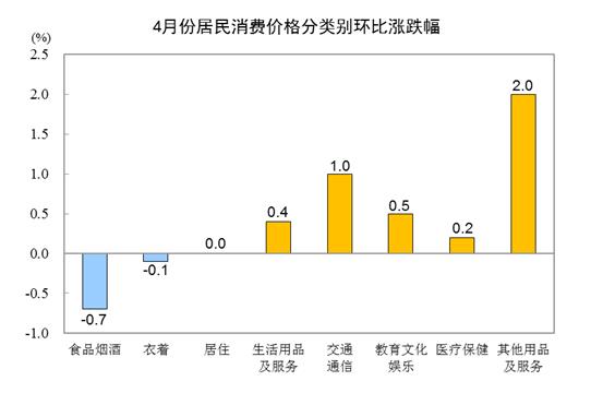 4月份,全国居民消费价格环比上涨0.1%。其中,城市上涨0.1%,农村持平;食品价格下降1.0%,非食品价格上涨0.3%;消费品价格下降0.1%,服务价格上涨0.3%。
