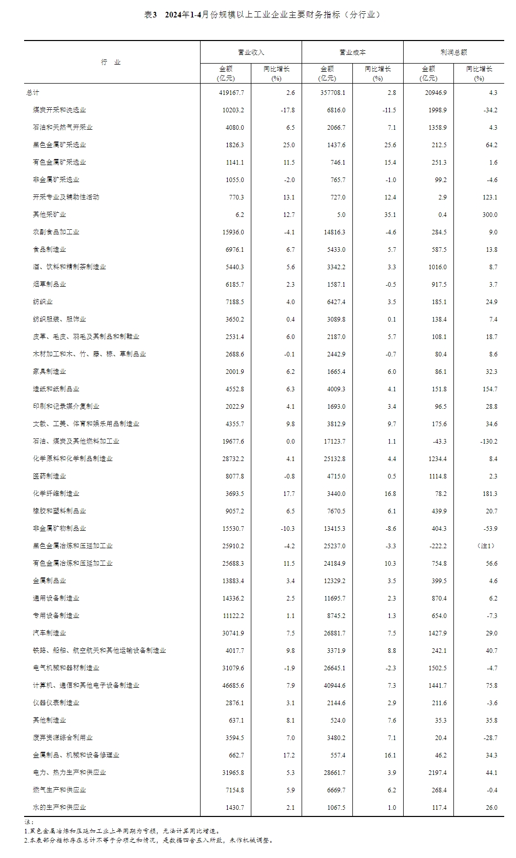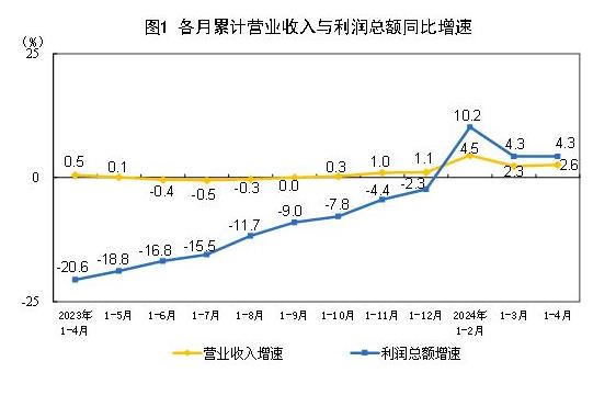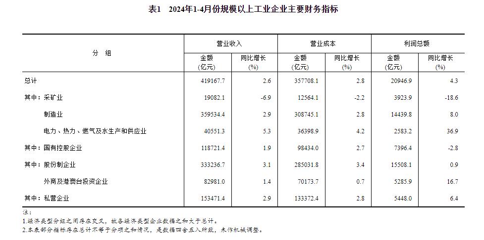 1—4月份,全国规模以上工业企业实现利润总额20946.9亿元,同比增长4.3%(按可比口径计算,详见附注二)。