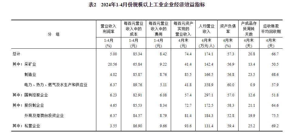 4月末,规模以上工业企业每百元资产实现的营业收入为74.4元,同比减少2.6元;人均营业收入为174.1万元,同比增加7.5万元;产成品存货周转天数为20.8天,同比持平;应收账款平均回收期为66.7天,同比增加3.4天。